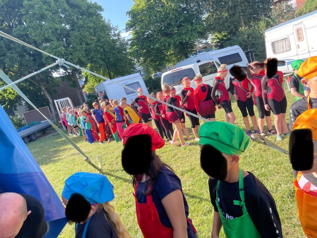 Anschließend fand die Generalprobe statt – der letzte große Test vor der Premiere. Die Kinder hatten die Gelegenheit, ihre Auftritte in der richtigen Reihenfolge im Zelt durchzugehen. Einige Abläufe klappten schon wunderbar, andere benötigten noch etwas Feinschliff. Aber auch kleine Unsicherheiten oder Patzer wurden mit einem Lächeln und gegenseitigem Zuspruch gemeistert. Das Wichtigste: Alle wuchsen mehr und mehr in ihre Rollen hinein, entwickelten Selbstvertrauen und hatten großen Spaß.